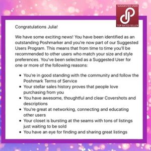 Since June of 2016 I have been chosen as a suggested user! I've also been on posh a long time and have over $10k in sales. Please feel free to ask me any questions and I'll do my best to help!