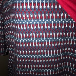 LuLaRoe L Irma that is blue with red and white arrows. Irma is Leggings material! So soft! LuLaRoe TC red leggings. Washed per LuLaRoe. Sold as outfit.
