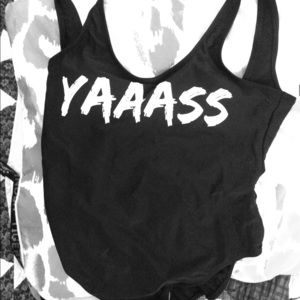 Never worn, medium full-body bathing suit with "YAAAAAS" imprinted on it. Tag still attached.
