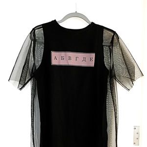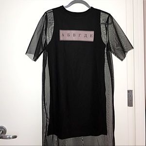 Sexy Bodycon black dress with Greek writing in faded pink text. With a long black mesh slip over it, making it very edgy. Brand new, never been worn. Bought in an upscale boutique in Dubai.