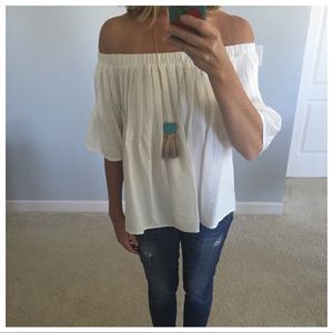 White Gathered Off the Shoulder Top. One of my favs💕 Feminine and flattering. Elastic and gathering around the top. Short bell sleeves. Material has slight crinkle effect. Measurements laying flat: S: 22" long, 18" pit to pit. M: 22.5" long, 19" pit to pit. L: 23" long, 20" pit to pit. 100% polyester. New Boutique Item, with Tags. #BB14