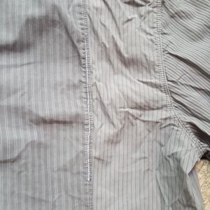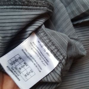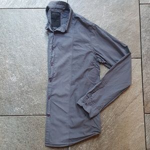 Guess Men's blueish purple gray Striped Button Up Shirt. Pin stripes vary by panel, shiny stitching randomly throughout. Size large may run small