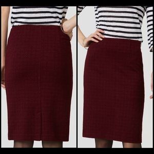 Beautiful Ann Taylor Loft pencil skirt in burgundy with a jacquard pattern. High waist with exposed zipper on side and center back slit. Elastic waistband and stretch fabric makes it flattering and comfortable for a full work day or night out. Polyester/Rayon/Spandex. Machine wash cold. Measures approximately: 26 1/2" length; 29" waist. Smoke-Free/Pet-Friendly. Worn once, excellent condition.