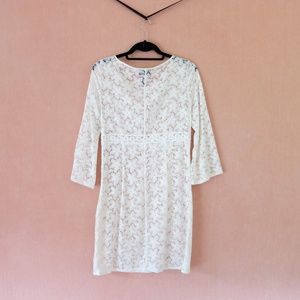 Play innocent in floral lace dress from Laundry by Shelli Segal. Featuring three quarter length bell sleeves and a wide scoop neck. Layer with a slip or rock it out with cutoffs and a bralette. No returns allowed. Please ask all questions before purchasing and I'll respond as soon as possible.