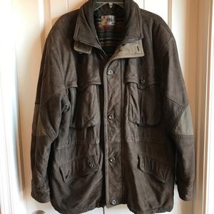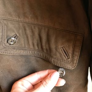 Some water spots shown in picture. Could use a good leather cleaning. One button missing on front pocket, but button is in the pocket, just needs to be sewn back on. Great, warm, jacket.
