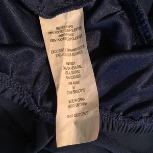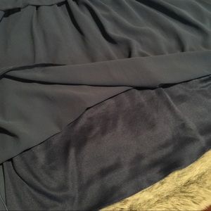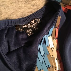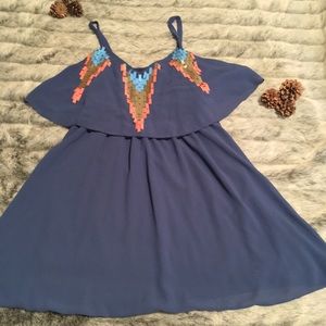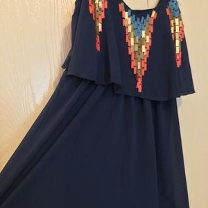 Such a cute blue Chiffon dress with rectangular gold/taupe, coral and light blue design on front. Elastic in the waist and around the top portion of the dress allows for ease of wear and comfort !! Pair with a cute crop jacket/sweater and sandals... or with leggings for more of a tunic look ! Only wore a few times on vacation and got TONS of compliments! Nice cool and comfy for daytime or night out!! Fully lined, Size Medium, slight flared flow.