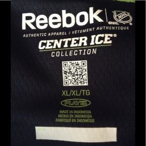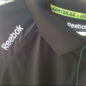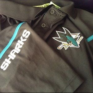 Reebok Center Ice Collection. NHL San Jose Sharks. Play Dry. Black with Turquoise S/SL Polo. Collar, 3 Buttons at Neck. Polyester . Size XL. Measures: Length: 31" ... Pit to Pit: 25" Excellent!
