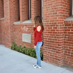 Well fitted, open shoulder sweatshirt. Featuring crew neckline, open shoulder with ruffle trim, long sleeve with cuffs, and ribbed trim detail.