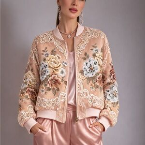 SPECTACULAR! I love this jacket so much! Zip front. All measurements are taken with garment laying flat. There is about 4" of stretch available so it will fit a wide range of sizes. 50% cotton, 50% polyester.