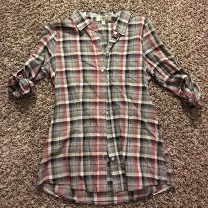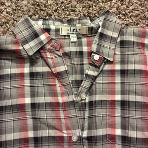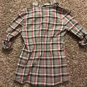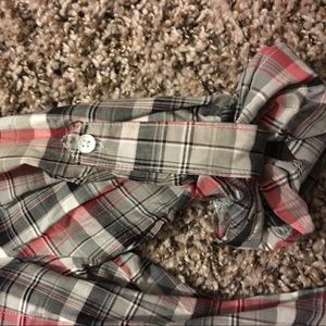never ended up wearing. black, red and grey plaid button up. front pocket and cinched in the back.