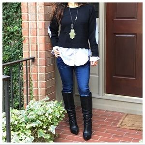 From my buying trip in Paris great sweater shirt this is a one piece stylish top part is a soft knit bottom is a striped shirt this is a one size measurements bust laying flat on one side 20 length 28