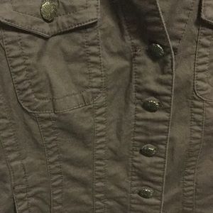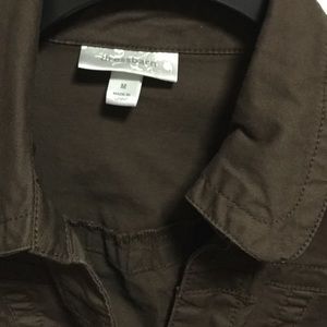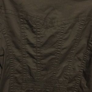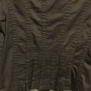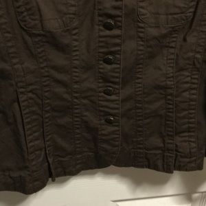 Brown lightweight jacket. Button front, 2 chest button pockets. Rolled cuff. Pleated look bottom back of jacket. Measurements: Underarm across the front 19.5”, length 21”.