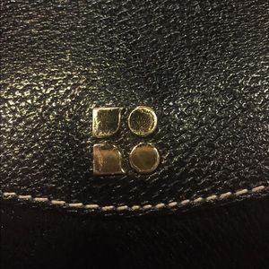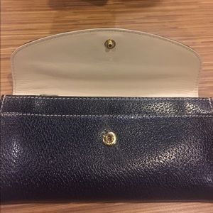 Black leather Kate spade wallet. Gently used. Smoke free & Pet free. One scratch on the inside fold shown in picture. Exterior metal hardware worn, also pictured