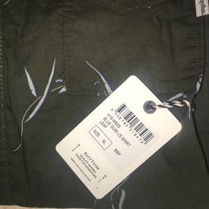 Rhythm Blue Gum shirt. Men's long sleeve shirt. All over pattern. Dual self patch pockets with button down flaps. Sleeve length: 25.75 inches. Shoulder to hem length: 27 inches. 100% cotton. Machine wash cold hang dry. 100% Cotton