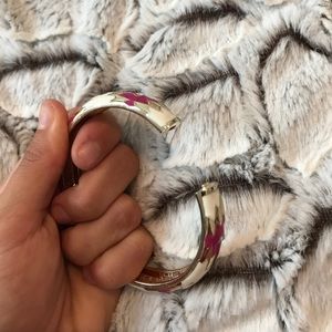 You get three bracelets in this deal. Two chevron bracelets that stack together, one in orange and one in pink. And then another bracket that has a pink gold and white pattern on it. All in perfect condition since I never used them before. Willing to sell separately if needed.