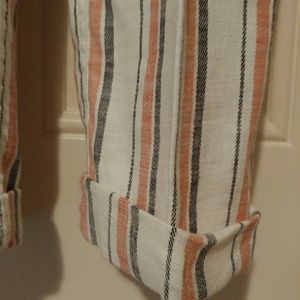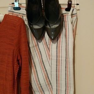 Shoes size 6 1/2 Grey leather, pants size 0 linen grey & burnt orange ankle length, shirt long sleeved polyester, nylon & cotton