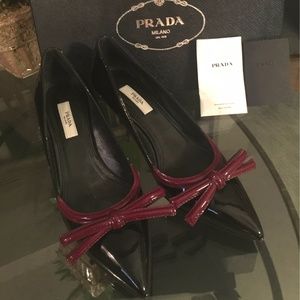 Excellent condition with box, description card and spare heel lifts. Slight wear on soles (see pics). These gorgeous nero and amarena colored pumps feature a contrasting bow detail atop patent calfskin leather.