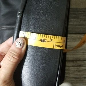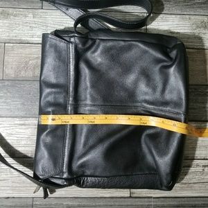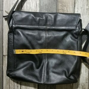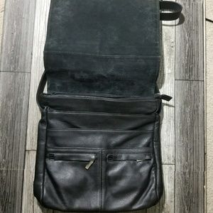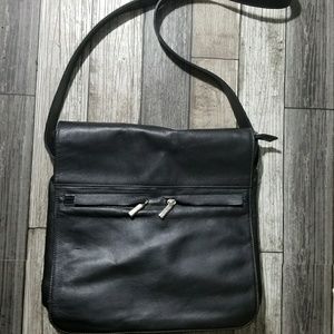 Black leather messenger flap bag with zip pockets on flap and under flap. Zipper closure on main compartment. Silver toned hardware. Adjustable buckle strap. Very good condition