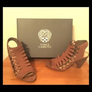 Vince Camuto Smoke Taupe Silk Goat ZIP Sandals. Only worn once! Great condition! Stored in original box (included). No visible signs of wear. Size 7.