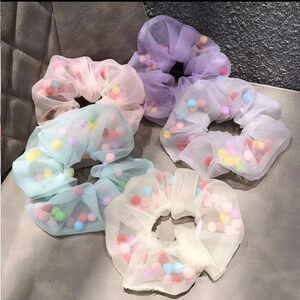 Colorful pom pom scrunchies. Five scrunchies in assorted colors. Bundle to get a discount.