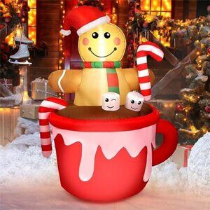 5FT Christmas Inflatable Outdoor Decoration, Gingerbread Man in Coffee Mug Blow
