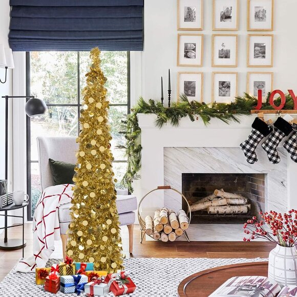 5FT Gold Christmas Pop Up Tinsel Tree Holiday Decor Collapsible