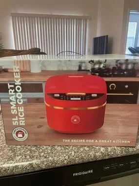 5L Smart Rice Cooker in red. Modern design with easy-to-use digital controls. Gold accent detail for a premium look. Reliable cooking performance for rice and more. Simple button operation for everyday use.