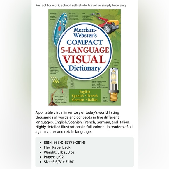 Comprehensive dictionary with detailed illustrations. Includes English, Spanish, French, German, and Italian.