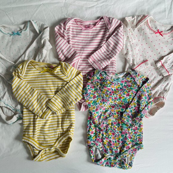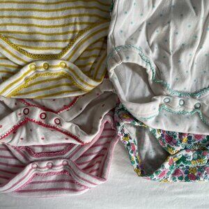Five 3-6 month long-sleeve onesies / bodysuits / baby bodies from Baby Boden. Very gently worn. No stains or markings. Most wear is noticeable on neckline of flower patterned bodysuit (I've noticed that's just the case with the Boden flower print on their onesies etc.). Others are polka dots and stripes, and all in great condition. Sweet little bows at neckline with feminine detailing on the cuffs and leg holes and neck line.