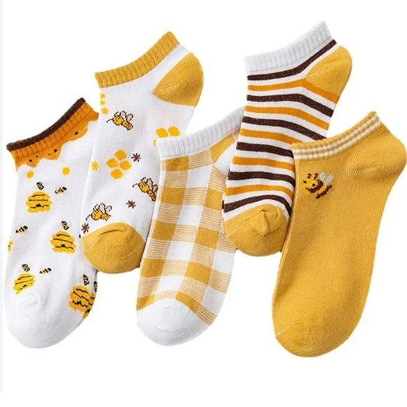 โจ Stay cozy and stylish with this adorable 5-pair honeybee-themed ankle sock set! Each pair features a unique design โ bees, honeycombs, stripes, checks, and solid yellow โ perfect for everyday wear or gifting to a bee lover.
