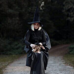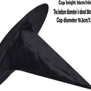 Quantity: 5 black witch hats for Halloween costumes or decorations. Usage: Can be used to decorate pumpkin monsters, garden monsters, or DIY floating witch hat lights. Material: Durable Oxford cloth, suitable for adults.