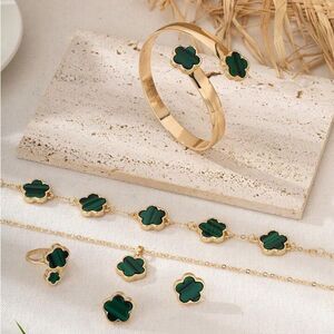 5-Piece Green Gold Tone Lucky Four Leaf Clover Zinc Alloy Bracelet Necklace Earrings Bangle Ring Matching Set