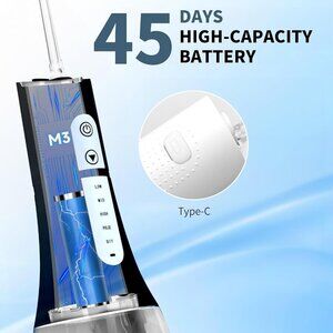 Key Features:5 Cleaning Modes – Customizable pressure settings for gentle to powerful cleaning.450ML Water Tank – Provides continuous flossing without frequent refills.5 Jet Tips Included – Achieves 360° cleaning for improved oral hygiene.Long Battery Life – Lasts up to 45 days on a full charge.IPX7 Waterproof – Safe for use in the bathroom and shower.Cordless & Portable – Lightweight and perfect for travel or daily use.
