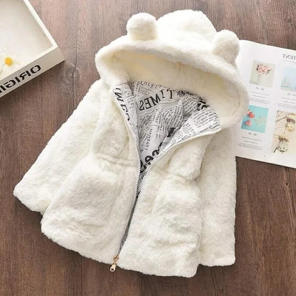 5T White/ BLK Teddy Bear/ Bunny Ears Girls Hooded Faux Fur Winter Coat Jacket