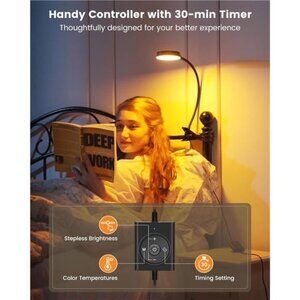 🧿[Considerate Bed Reading Light] This premium reading lamp for bed boasts a sturdy clip with a generous 2.36-inch opening and anti-slip pads, ensuring a secure grip on desks, bed headboards, dormitory beds without damage. Its versatile design makes it ideal for various settings, such as a bunk bed light, a clip lamp, a dimmable bed reading light, or even a workbench light. Plus a handy controller and a 30-min auto of timer, makes it a perfect reading light for bed headboard.