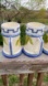 Set of ceramic mugs featuring vibrant fruit designs. Perfect for adding a splash of color to your kitchen. This is a vintage set of 5 mugs white background blue trim with fruit design.