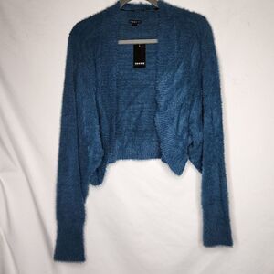 5X 28W Torrid Blue Shrug Eyelash Sweater Bolero Textured Knit Crop 90s Y2K Fuzzy soft long sleeve open neck. NWT Torrid. Shrug only. Measurements for reference only approximately neck to hem 20" sleeve inseam 20" wt 1lb 2oz