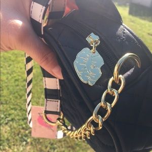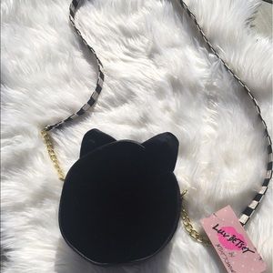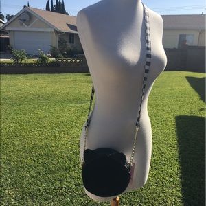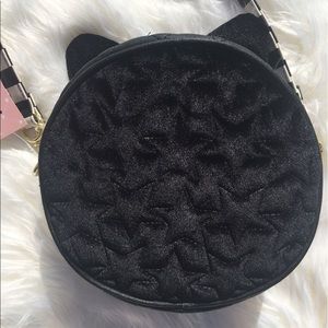 The CUTEST black quilted Betsey Johnson cross body bag. Adorable cat ears and velvet quilted star design throughout. Perfect size for going out. Black and white striped strap with gold hardware. Striped cloth interior. New with tags! You won't be able to find this bag elsewhere. Perfect gift for the cat fanatic! 7" diameter and 2.5" wide. 24" drop.