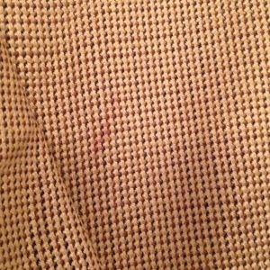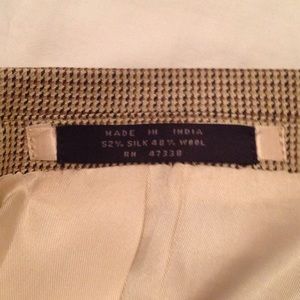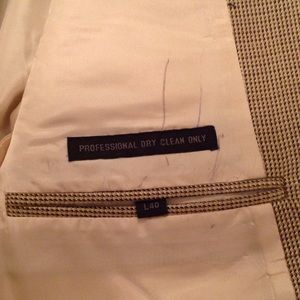 40L Tan 3 button down blazer with 4 buttons on each sleeve. There is lipstick on the right side and pen markings by the inside pocket. Pocket square not included. Overall, in good pre-owned condition