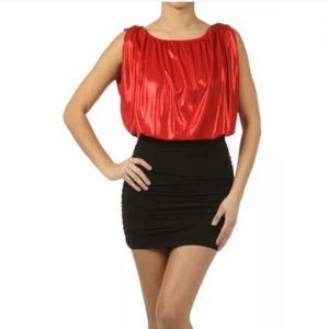 You'll love this shimmering metallic dress! Featuring a blouson style blouse looking top half that has a pretty metallic shimmering sheen to it. Bottom half of the dress is solid black with a fitted ruched detail along the sides for a flattering fit. Stretches. Short mini length.