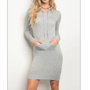 So soft and comfy, heather gray hooded sweatshirt dress w front pockets. 60% rayon, 37% polyester, 3% spandex.
