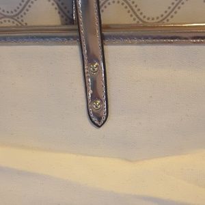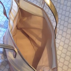 Beautiful rose gold canvas tote bag from Victoria's Secret. This bag is very pretty with the metallic rose gold and soft canvas. Zips closed. There is lots of room in this tote. Great to use for EVERYTHING! A weekend bag, a beach bag, a bag to store your current craft items. The possibilities are endless. The outside measurements laying flat are 20.5 by 13.5. Love, Love, Love this bag... I bet you will too! FREE GIFT WITH EVERY PURCHASE!