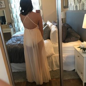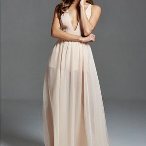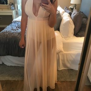 This is 100 percent polyester with tiny blush colored polka dot texture on the dress! Shorts underneath