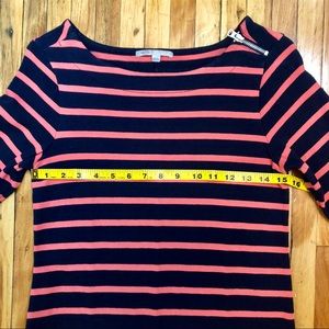 This is a great, classic navy and pink striped dress from Gap that I bought years ago and wore a handful of times. It’s made of a really nice, thick cotton and lands above the knee while the sleeves hit just above the elbow. There is a small zipper detail on one shoulder.