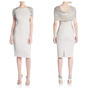 Gorgeous Badgley Mischka polished crepe sheath with sparkling draped shoulders.