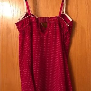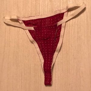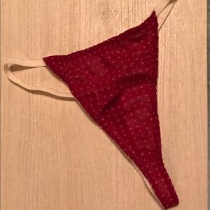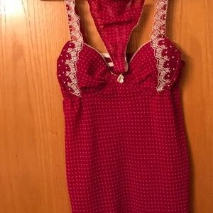 Deep pink/muted red (beet/cranberry) with polka dots and lace trim. Bra top camisole with matching high waisted thong.