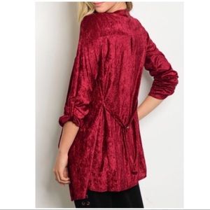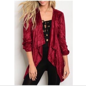 Burgundy Crushed Velvet Waterfall Cardigan. Long sleeve crushed velvet draped cardigan. 100% Polyester. Made in the USA!!