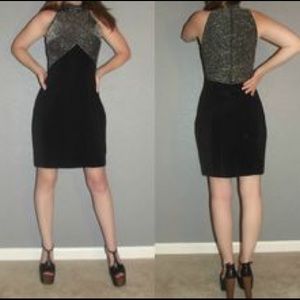 Seriously Stunning Mini Dress 80’s vintage Tadashi Shoji Bodice is made of a more structured (but still stretchy) black and silver. In excellent vintage condition