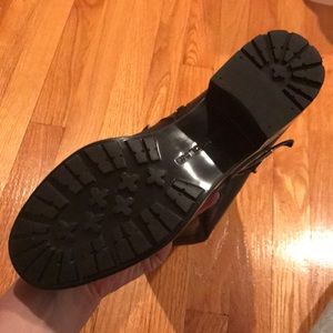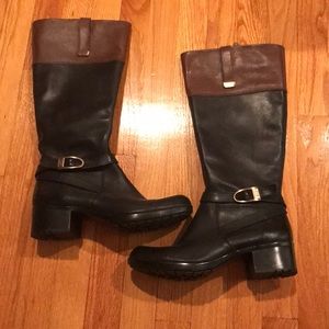 Bandolino black leather boots with 1 inch heel and brown strap at top. Worn once.