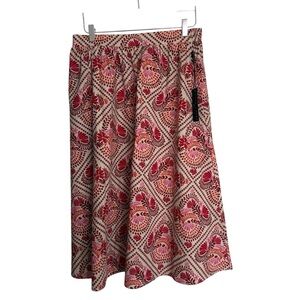 Kate Spade Saturday women's geometric print mini skirt size 4. The skirt is lined and has a slit on the front, but the temporary stitching is still intact. Side zipper and hook closure. Great pre-owned condition with no holes or stains.